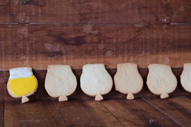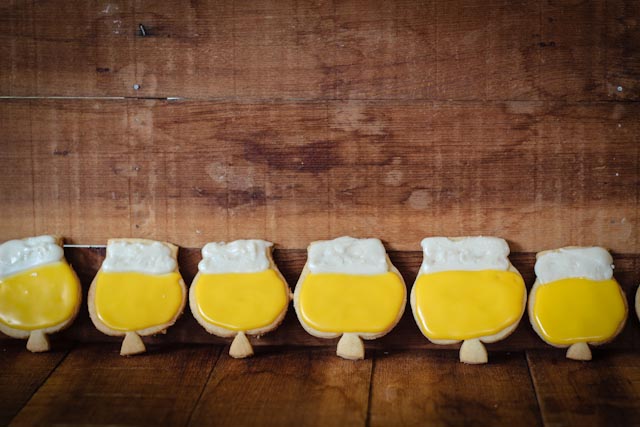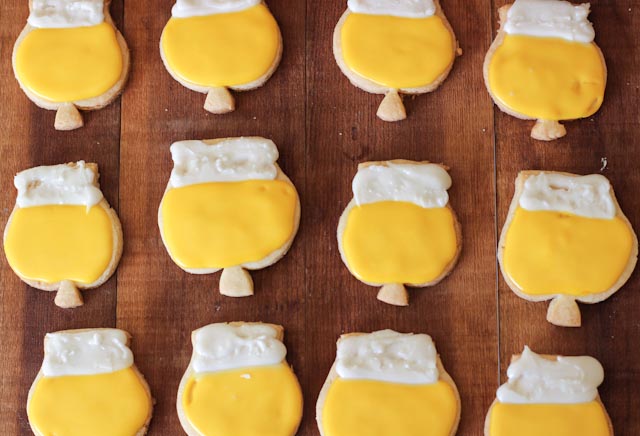7. Whisk icing ingredients together, make sure that the icing is very thick so it will keep the piping shapes you want. Make sure to add more powdered sugar if necessary. I used two toothpick swipes of yellow and two of orange to get the beer color and no coloring for the “foam”. I disturbed the drying process to make the foam look more foamy. I let the frosting dry overnight on wire racks to ensure it was hard enough to transport.