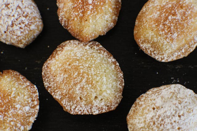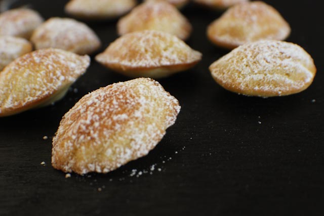 5. Bake for about 7-10 minutes. I would bake for 5 minutes, rotate the trays, then set your timer for 3 minutes and check them. I happen to like my madeleines with color and crunch, so I cook them longer but you might prefer them a little less cooked. It’s all about preference. After they are done, let them sit in the tray for a few minutes and then place on wire racks to cool. After the madeleines cool to about room temp, you have the option to dust with powdered sugar or dip in chocolate or brush with a frosting glaze.