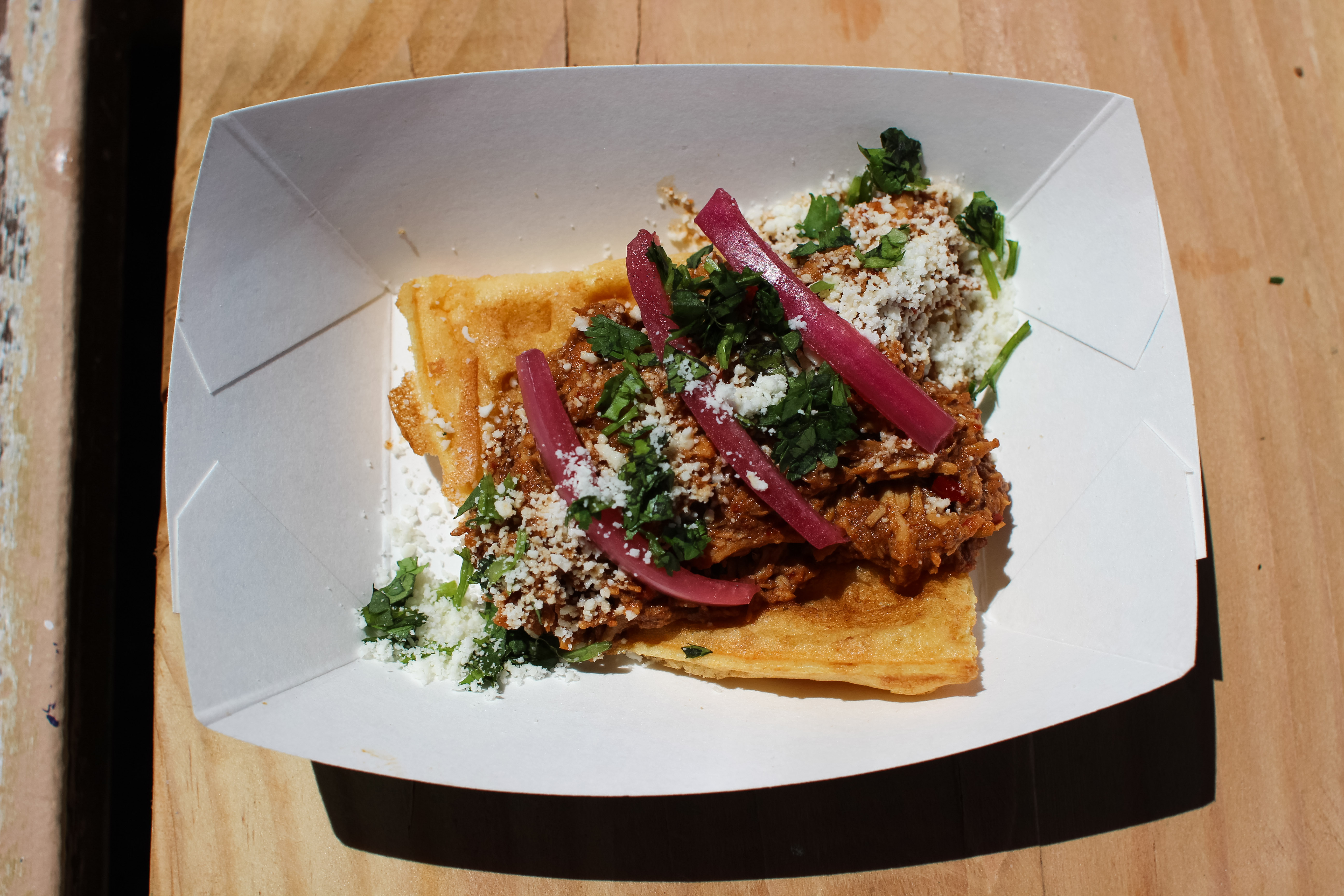 The Iron Press waffle taco Beef marinated with mexican chiles, aztec spicy coffee rub and piri piri. Garnished with cilantro, radish and served with Lucky Habanero Salsa. The meat was flavorful but my waffle was kinda mushy which may have been because this was close to the end of the event and I am sure their equipment didn’t have the same juice it did earlier in the day. Waffles are tricky bastards.