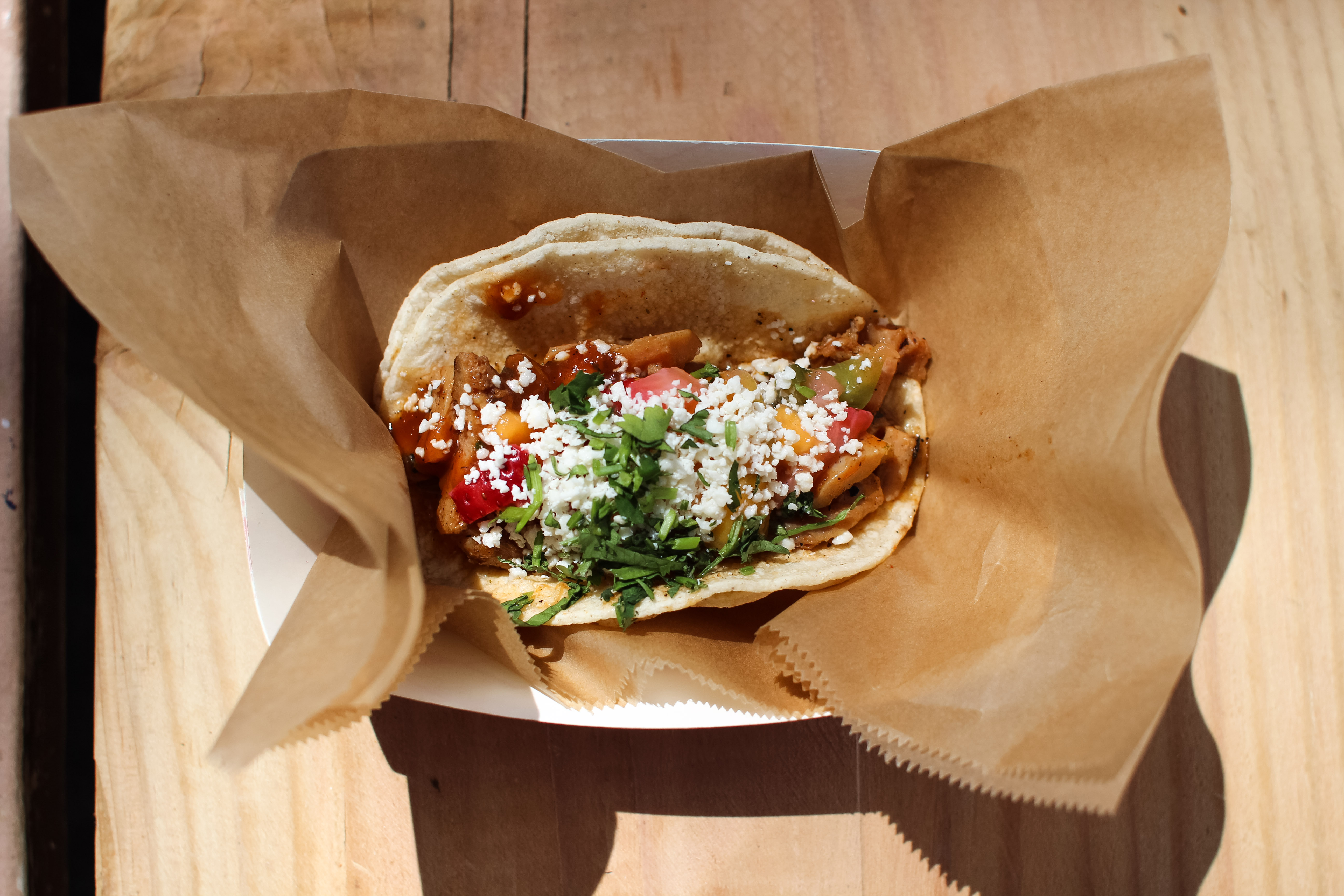 This one was my favorite one, and consequentially this taco won the contest. This was Hopscotch’s Lamb Al Pastor served on a grilled corn tortilla topped with fresh cut pico de gallo. It wasn’t the most pretty and polished-looking taco, but I am a freakin sucker for fried garbanzo beans. The meat was super flavorful and the texture was excellent. I gave this one the most points over the rest of the tacos.