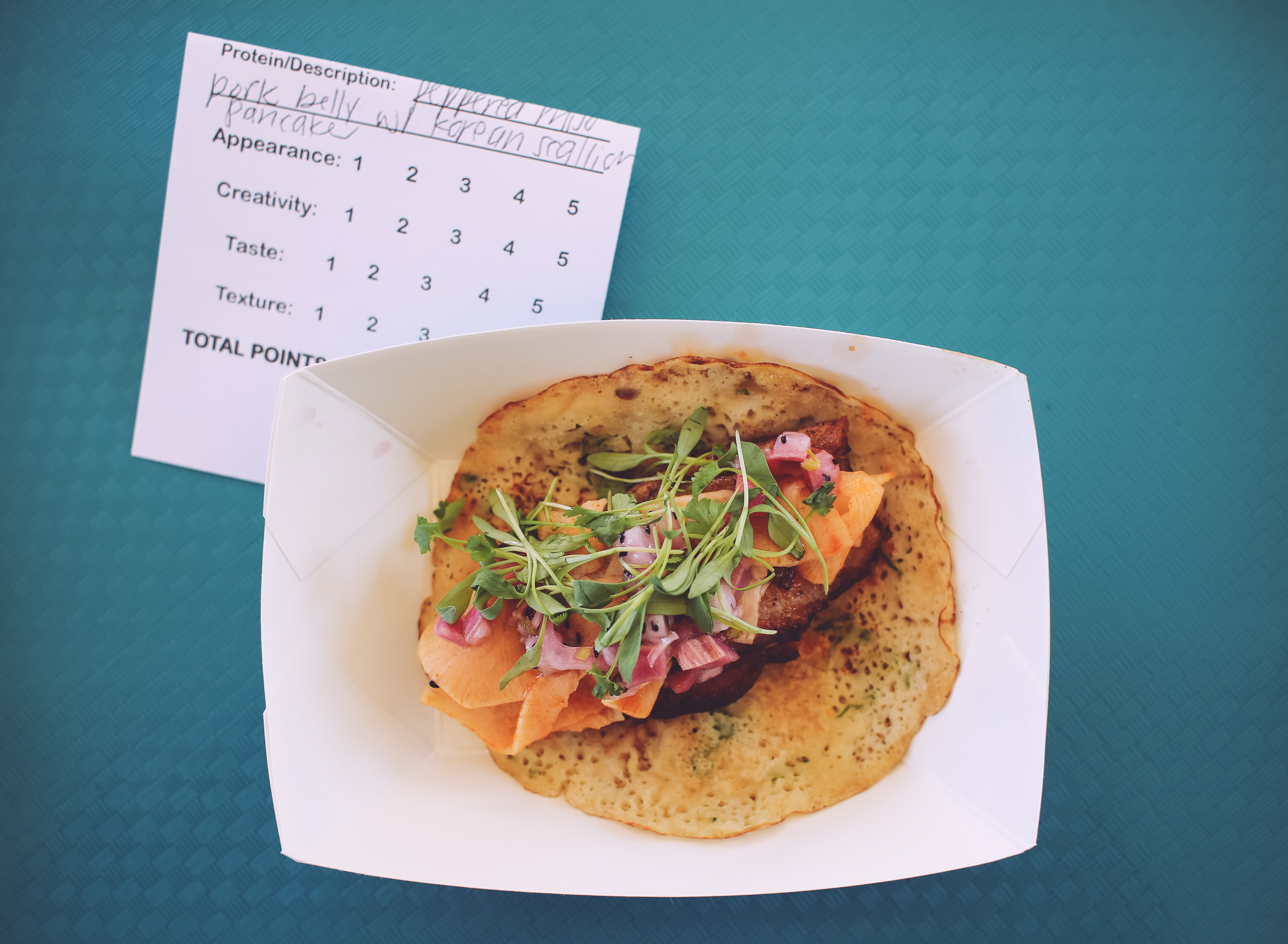Come on, everyone knows who this taco belongs to. I know it’s the Iron Press taco, because they are the only ones doing waffle tacos. Regardless of knowing who this was, I tasted the taco with an open mind. I am sorry guys but I really didn’t like it. It was too dry and all I could taste was the kimchi and a lot of dough-y-ness from the waffle. I would recommend par cooking the waffle then flash frying it next time to keep a crunchy exterior to allow for the inside meat to really shine through.
